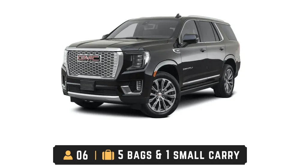 Experience refined travel in our GMC Yukon - ideal for airport transfers, hourly services, and more. Enjoy comfort and style on every journey
